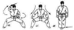 16. Левую ногу отвести назад, за правую, в стойку са-тан-мот. Вдох.