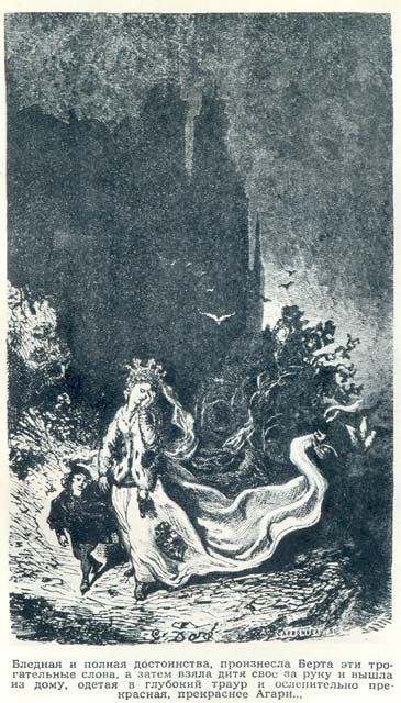 Берта не хотела слушать никаких увещеваний. Уныние, овладевшее всеми, было столь велико, что мост оказался опущенным, и Берта ускорила шаг, дабы поскорее выйти из замка, опасаясь, как бы внезапно мост снова не подняли; но никто не помышлял об этом, так были все удручены и растеряны. Берта села у края рва, откуда был виден весь замок, обитатели коего со слезами на глазах умоляли ее остаться. Бедняга Батарне стоял, положив руку на цепь подъемного моста, немой и неподвижный, словно каменное изваяние святого над воротами замка; он видел, как, проходя по мосту, Берта велела сыну отряхнуть прах от ног своих в знак того, что отныне они навсегда порывают с родом Батарне; то же сделала и она сама. Затем, торжественно указуя перстом на владельца замка, она обратилась к сыну со следующими словами: