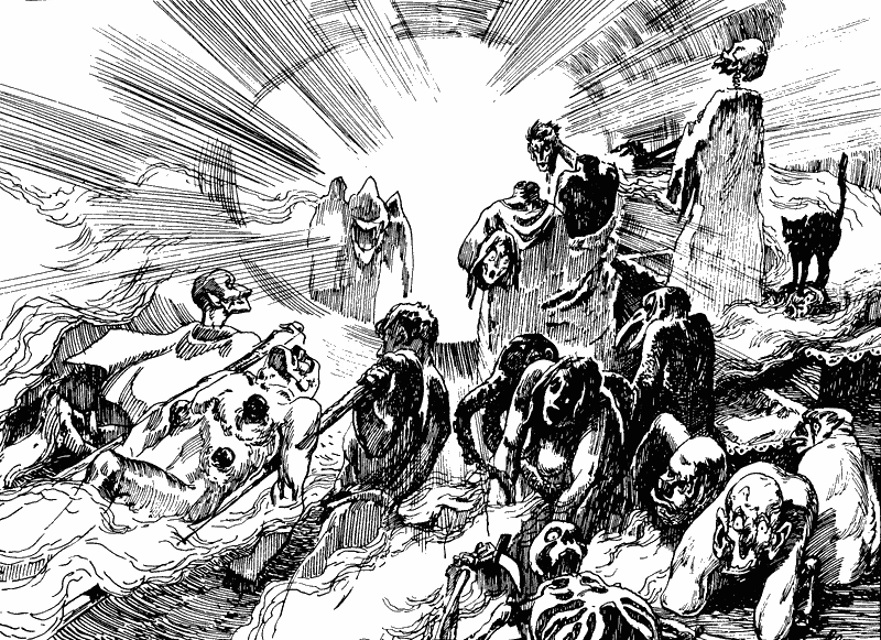 Я повернул голову, уставился на дверь спальни и тут же завопил от ужаса. Из-под двери через небольшую щель в комнату буквально вливался бесконечный, извивающийся поток жирных, черных тел, каждое из которых своими размерами напоминало мускатный орех. Одна за другой мухи расправляли крылья и с жужжанием подлетали к столу, где садились и вонзали в меня свои взоры — неподвижная черная масса, возглавляемая тремя лидерами.