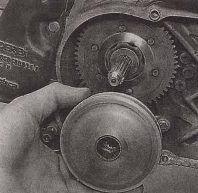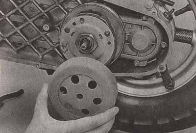 Сцепление так же, как и прочие узлы трансмиссии, после увеличения мощности двигателя нуждается в обязательной перенастройке. Момент срабатывания сцепления, также, как и вариатор — обычно настраивают на значение оборотов, соответствующее максимальному крутящему моменту. Таким образом, обеспечивается наиболее эффективное троганье с места и разгон. Если сцепление будет срабатывать раньше этого момента, двигателю просто не хватит мощности и момента, чтобы стронуть скутер с места, если позже — мы снова получим рывки и провалы в динамике разгона, плюс потерю части рабочего диапазона двигателя, который останется в «холостом» секторе тахометра. Настройка сцепления осуществляется подбором жесткости пружин, стягивающих колодки. Сцепление работает по инерционному принципу: вращаясь, благодаря центробежной силе, колодки расходятся и прижимаются к «колоколу» — ведомому барабану сцепления. Пружины, в свою очередь, противодействуют расхождению колодок, таким образом, изменяя жесткость пружин (заменяя пружины на более жесткие или мягкие) мы можем регулировать момент срабатывания сцепления. Важно помнить, что все пружины должны быть одинаковой жесткости, в противном случае, колодки будут работать с перекосом, изнашиваться неравномерно, их может даже заклинить или наоборот, сцепление будет недовключаться и буксовать на ходу. Процесс настройки сцепления достаточно трудоемкий, так как невозможно теоретически рассчитать оптимальный момент срабатывания, ведь у большинства скутеристов нет динамометрического стенда, который «нарисует» графики мощности и крутящего момента. Так что придется несколько раз разбирать-собирать сцепление, чтобы найти именно те пружины, которые обеспечат наилучшую динамику. Для облегчения этой трудоемкой процедуры существует так называемое регулируемое сцепление, в котором можно при помощи винтов изменять предварительное поджатое пружин, тем самым изменяя их жесткость. Кроме того, такая система позволяет не только единожды настроить сцепление, но и практически полностью исключить отрицательные эффекты, которые вызывает неравная жесткость обычных пружин (которая в той или иной степени практически всегда присутствует). Колодки сцепления тоже иногда заменяются на тюнинговые. Такая замена позволяет сделать момент троганья более резким и быстрым. Разумеется, подобная модернизация не лучшим образом сказывается на комфорте, но является неоспоримым преимуществом с точки зрения улучшения динамики скутера. Кроме того, поскольку колодки сцепления выполняют роль центробежных грузов для самих себя, иногда заменой колодок на аналогичные, но с большей или меньшей массой, удается более точно настроить механизм, особенно, когда не хватает диапазона поджатия пружин регулируемого сцепления, или нет подходящих пружин нужной жесткости для обычного, нерегулируемого сцепления.ЗАДНИЙ РЕДУКТОР