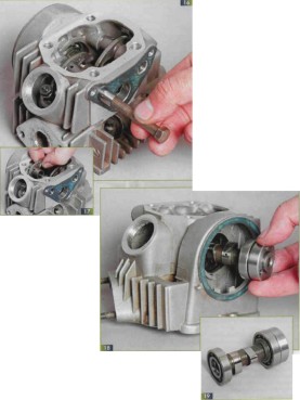 Осматриваем кулачки вала для оценки их износа. При необходимости заменяем распределительный вал вместе с подшипниками (19).