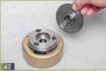 Если необходимо, можно заменить и звездочку обгонной муфты (42). После обратной установки смазываем цепь специально предназначенной для этого смазкой. При заворачивании болтов можно использовать резьбовой герметик.