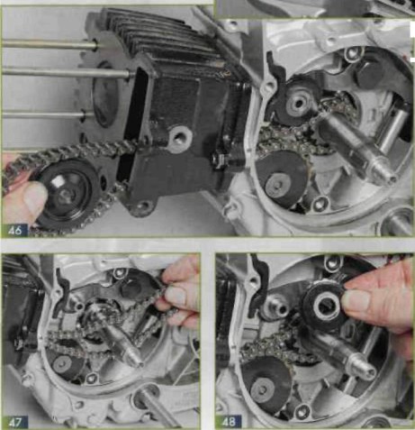 Удаляем подвижное колесо натяжителя ГРМ (47) и извлекаем цепь через полость картера (48).
