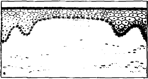 Рис. 11.43. Типичная форма красного плоского лишая. Патогистологически в эпителии гиперкератоэ и паракератоз. В собственно слизистой оболочке непосредственно под эпителием отек и диффузный воспалительный инфильтрат. Микрофотография. х 100.
