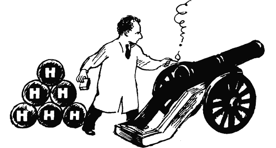 Естественные радиоактивные элементы (в данном случае это был полоний) испускают так называемые альфа-лучи: ядра атомов гелия. Гелий имеет атомный вес 4, следовательно, его атомы вчетверо тяжелее атомов водорода, атомный вес которого равен 1. Альфа-частицы, сталкиваясь с ядрами атомов водорода — протонами, — передают им свою энергию. А так как масса протонов мала в сравнении с массой альфа-частиц, то они приобретают большую скорость, которая позволяет им проходить через преграду. Вот почему водород делает металлическую пластинку как бы проницаемой для излучения. Просто? Очень просто! Однако самое интересное было впереди. Когда камеру заполнили другим газом — азотом, то вспышки на экране стали появляться точно так же, как если бы в приборе был водород. Это было уже совсем непонятно. Ведь ядра атомов азота много тяжелее, чем альфа-частицы (в 3,5 раза), и если перегородка непроницаема для гелия, то тем более она должна задерживать азот. Но почему же все-таки появляются вспышки на экране? Как проходят радиоактивные частицы через экран, который может пропускать в лучшем случае только ядра водорода? Может быть, к азоту случайно примешан водород? В камеру был впущен азот, тщательно очищенный от каких-либо посторонних примесей и, особенно, от водорода. Однако вспышки на экране появлялись с прежней регулярностью. Оставалось предположить только одно: очевидно, водород каким-либо образом образуется в камере из азота под действием радиоактивного излучения. Поначалу эта мысль показалась дикой. Но последовали опыты, убедительно доказывающие, что предположение было совершенно правильным. Да, действительно, из азота в камере образовывался водород! Так была реализована первая ядерная реакция, увидев которую добропорядочный химик середины прошлого столетия долго и недоуменно пожимал бы плечами и так бы ушел, ничего не поняв. Вот она, эта реакция: