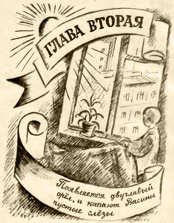 В темноте ящика орлиные головы замотались на тонких шеях. — Мальчишку в холодную повели. Ему там, наверно, страшно. Он там, наверно, плачет. А мы здесь, — сказала сипло левая. — Так-то оно так, да не совсем, — прохрипела правая. — А может, он и не плачет. Или плачет, да не пустыми слезами. — Помолчи, — сердито сказала левая. — Вечно ты во всём сомневаешься! Надо выбираться из этого ящика. Надо — к мальчишке… — Так-то оно так… — начала было правая, но левая клюнула её, и они замолчали. Монета подкатилась тихонько к углу ящика, и головы увидели щель. Щель была узкой. — Надо пролезть, — сипнула левая. — Так-то оно так… — начала было правая, но левая снова клюнула её. Они поставили монету на ребро, сунули её в щель и свалились на пол. Пристав услышал, как что-то брякнуло, заглянул под стол, но ничего там не увидел. Монета уже откатилась к двери. Тем временем Вася сидел на голых дощатых нарах. Что же дальше будет? Может, Минька догадается, что его посадили в холодную, и как-нибудь выручит? А если не догадается? Или не сможет выручить? Так и придётся сидеть в этой холодной? Жутко Васе стало. Он съёжился совсем в комочек и заплакал. Теперь уж что! Теперь плакать можно, монеты-то нет! А монета лежала по ту сторону обитой железом двери. Головы орла слышали, как всхлипывает Вася, и сами чуть не плакали от досады. Бились головами об обитую железом дверь и зло скрипели клювами. Звякнул засов. Дверь отворилась, вошли двое городовых. — А это что за гусь? — спросил один городовой. Второй взглянул на бумаги, которые держал в руках, пожал плечами. — По списку не числится. «Надо их перехитрить», — подумал Вася, поднял голову, сдвинул брови, посмотрел грозно на городовых да как крикнет: — Что значит гусь? Кто тут гусь? Я — гусь? А я вот вовсе не гусь! Я — октябрёнок! Понятно? Ок-тя-брё-нок! — отчётливо повторил он.