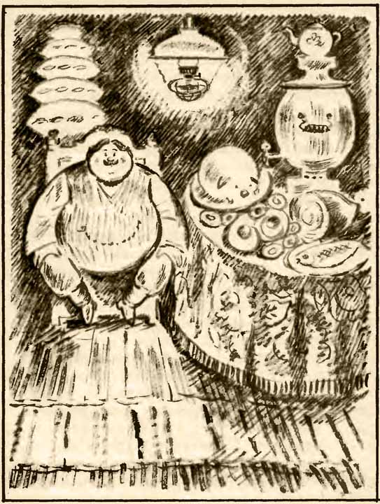 Минька взял кочергу, повертел в руках. — Нет, не сможете. — А ну дай сюда! Минька дал Купеческому сыну кочергу. Тот связал её в узел и бросил на стол. — Видал? — Подумаешь, — почти пропел Минька и незаметно подмигнул Васе. — А вот простого пятака пополам вам ни за что не разломить! — Мне? Не разломить? Пятака? — рассердился Купеческий сын. — Вася, дай ему пятак, — быстро сказал Минька. Вася достал свою монету из кармана и молча протянул Купеческому сыну. Мальчики, взявшись за руки и затаив дыхание, следили, как мнут монету огромные жирные пальцы. Она то совсем тонула в них, то появлялся её сверкающий край. Сначала Купеческий сын пробовал поломать её одной рукой. Монета не поддавалась. Тогда он ухватил её пальцами обеих рук и начал давить. Лицо его побагровело от напряжения. Монета не поддавалась. Купеческий сын шлёпнул ею о стол. Вытер краем скатерти пот со лба и шумно передохнул. — Надо подкрепиться, — сказал он и крикнул. — Эй, кто там! Каши! И тотчас две девушки-прислуги поставили перед ним огромный котёл с кашей, целый каравай хлеба и поварёшку. Вася с Минькой и переглянуться удивлённо не успели, как котёл оказался пустым, а Купеческий сын уже облизывал поварёшку, стряхивал со скатерти хлебные крошки и отправлял себе в рот. — Сейчас я её поломаю, — сказал он и взял со стола монету. Надулся Купеческий сын, закрякал, запыхтел, чуть не надорвался, а так ничего и не смог поделать с монетой. Даже не согнул. — Что она у вас, заколдованная? — рассердился он. — Я одной рукой десять пудов подымаю. Я за копейку одним щелчком человека могу убить! Я пол-аршина сукна в аршин вытягиваю! А тут пятака не сломать! Да вы кто такие? А может, вы воры? Может, вы этот пятак у меня украли! Крепче моих денег ни у кого не сыщешь! Значит, и этот пятак — мой. — И вовсе он не ваш, — сказал Вася. — Это мой пятак. Отдайте. — Ишь какой быстрый! У купца денежку хочет отнять! — Отдайте! — настойчиво повторил Вася. — Эй, кто там! — крикнул Купеческий сын. — Зовите городового. — Ну его! — сердито шепнул Минька. — Пойдём отсюда. А то и верно городовой придёт, ф-фараон! — Не пойду, — сказал Вася. — Моя монета, и я без неё не уйду! В дверях появился Городовой. Краснолицый, сивоусый, в чёрной шинели, с шашкой на боку. — Ага, ага, — обрадовался Купеческий сын. — Вот он, заступничек наш, вот он, его благородие господин Городовой пожаловал! — Чего случилось, господин Купецкий сын? — спросил Городовой густым голосом и вытер пышные сивые усы.