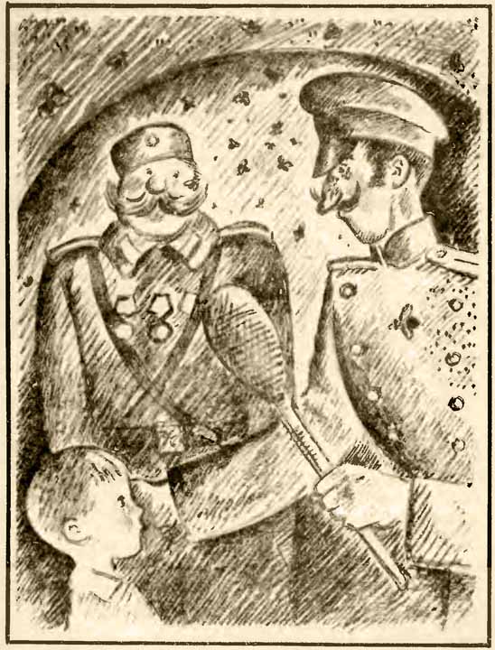 Генерал жил в особняке, на улице, мощённой тесаным камнем. Возле парадного стояли на карауле рослые солдаты. Сверкали штыки. Минька и Вася остановились на противоположной стороне улицы. — Эх, не пустят к генералу, — сказал Минька. — И никакой хитростью солдат не перехитрить. — Я попробую. Вася подошёл к парадному. Солдаты скрестили перед ним винтовки. — Хода нет. — Я — сын генерала Сомова. Иду к вашему Генералу по делу, — сказал Вася важно. Солдаты переглянулись и пропустили. Вошёл Вася в особняк. А там народу!.. Офицеры шпорами звенят. Слуги туфлями шаркают. Женщины шёлковыми платьями шуршат. На Васю никто и внимания не обратил. «Надо бы спросить, который тут Генерал», — решил Вася, подошёл к одному офицеру с золотыми шнурками на груди, а как обратиться — не знает. То ли дело у нас: товарищ лейтенант, товарищ майор или товарищ маршал! А тут… Вспомнил Вася, что городовой называл пристава вашим благородием. — Здравствуйте, ваше благородие. — Я не просто благородие. Я — высокоблагородие! — сердито сказал офицер. — Не видите разве, что я полковник! — Извините, высокоблагородие, — сказал Вася, — погоны очень высоко. Не разглядеть. Скажите, пожалуйста, где найти Генерала? — Гм… А вы кто ж будете? — Я — сын генерала Сомова. — Его высокопревосходительство господин Генерал у себя в кабинете. Третья комната направо, пятая дверь налево! — и полковник звякнул шпорами. Прошёл Вася одну комнату, другую, третью. Отыскал пятую дверь налево. Постучал. За дверью кто-то как зарычит: — Р-р-ракалии, каналии! Испугался Вася. Входить или не входить? А может, тот, кто рычит, и кусается? Да раздумывать особенно некогда, надо монету пополам разломить. Толкнул дверь. А за дверью — пусто. Вдруг кто-то в углу как гаркнет: — На кар-раул! Крр-ру-гом! Ать, два!