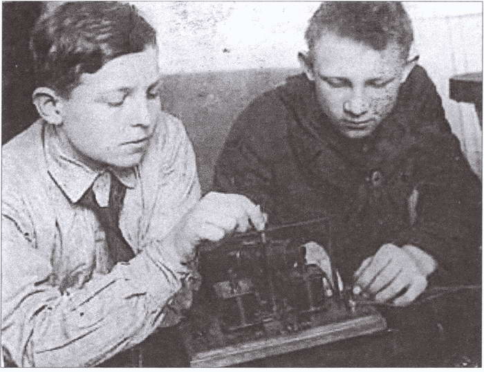 Школьники Юрий Мажоров (слева) и Анатолий Барамыкин собирают первый радиоприемник. 1935 г.