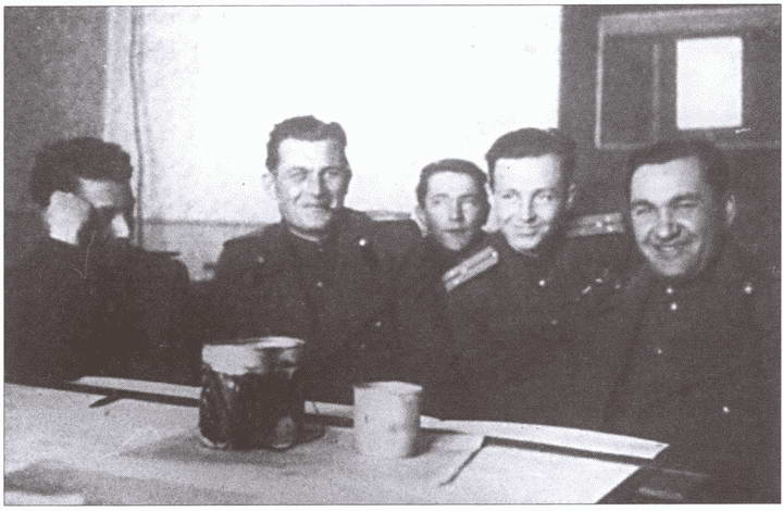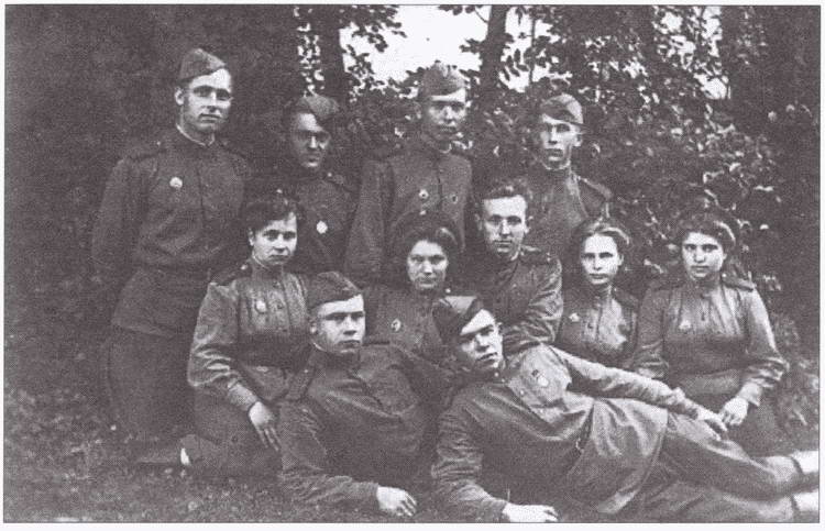 Начальник ума связи лейтенант Юрий Мажоров (третий справа во втором ряду) со своими подчиненными