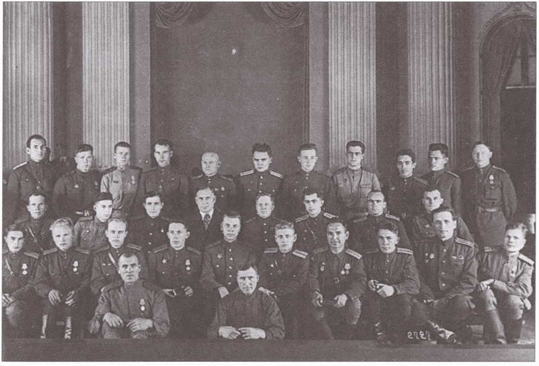 Первое в годы войны вручение наград радиоразведчикам 1 ОРП ОСНАЗ Ставки ВГК. Москва. Кремль. Октябрь 1943 г. 1-й ряд сверху (справа налево): Крылов, Модебадзе, Бых, Мажоров, Чайка. 2-й ряд сверху (справа налево): Сазыкин, Уржуниев, Добродий, Миронов