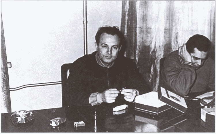 Мажоров (слева) и Есиков готовятся к работе с аппаратурой американского разведывательного корабля «Пуэбло». Северная Корея. 1968 г.