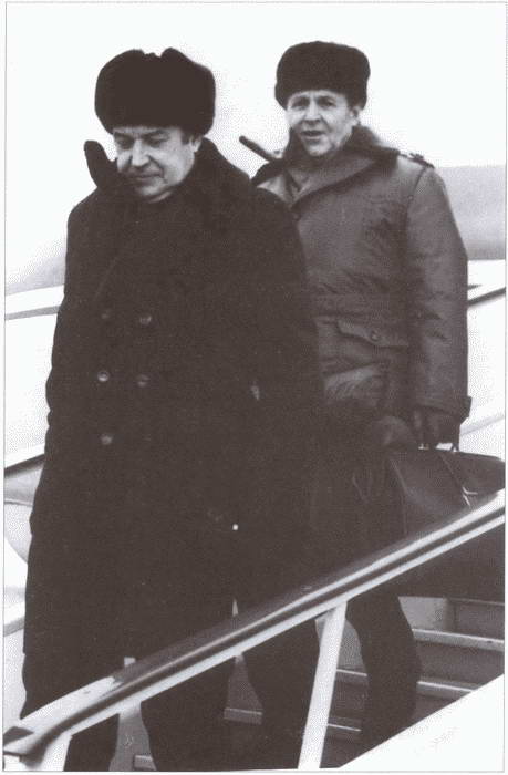 А. Туполев и Ю. Мажоров спускаются по трапу самолета