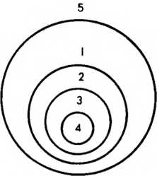 1 — ощущения; 2 — структурно организуемая априорными средствами апостериорная область объектов опыта (=науки=истины=природы); 3 — трансцендентальные способности субъекта, которыми порождаются априорные средства; 4 — так называемая трансцендентальная апперцепция; 5 — трансцендентная область внеопытных объектов, т. е. мир вещей в себе. Ограниченные окружностями «участки поля» нельзя понимать в смысле субординации логических кругов Эйлера