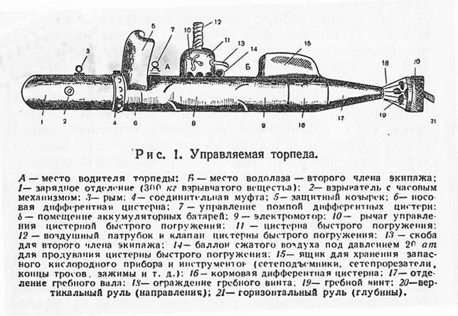 Рассмотрим теперь «Майяле» с носа до кормы. Головная часть — зарядное отделение, содержащее 300 кг взрывчатого вещества, — соединено с корпусом торпеды посредством муфты и может легко отделяться. Далее в корпусе находится носовая дифферентная цистерна и над ней — сиденье для водителя, защитный козырек и доска с приборами управления и контроля. В средней части торпеды помещаются аккумуляторные батареи и электромотор, а над ними — цистерна быстрого погружения и воздушный патрубок с клапаном. Продувание цистерны производится сжатым воздухом из баллона, расположенного сзади нее. Затем имеется сиденье для второго члена экипажа, который спиной прислоняется к ящику с рабочим инструментом (пневматические сетеподъемник и сетепрорезатель, ножницы, зажимы, именуемые «сержантами», для подвески зарядного отделения под килем корабля противника, достаточной длины трос, намотанный на доску, который на нашем языке называется «подъемник»). Дальше в корпусе торпеды помещается кормовая дифферентная цистерна, отделение гребного вала, гребной винт с оградительной решеткой, горизонтальный и вертикальный рули.