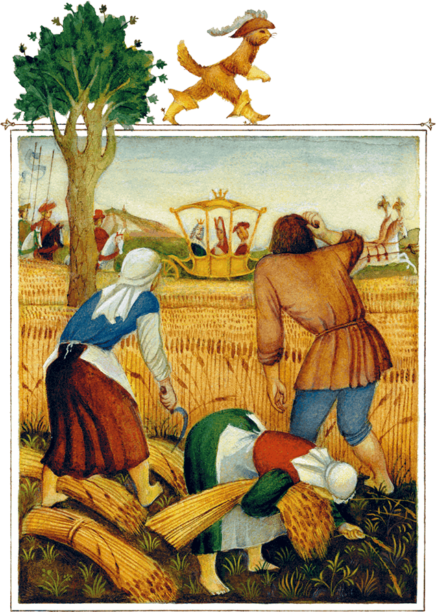 Кот был в восторге от того, что всё идёт как по маслу, и весело побежал перед каретой. По пути он увидел крестьян, косивших на лугу сено. – Эй, люди добрые, – крикнул он на бегу, – если вы не скажете королю, что этот луг принадлежит маркизу де Карабасу, вас всех изрубят в куски, словно начинку для пирога! Так и знайте! Тут как раз подъехала королевская карета, и король спросил, выглянув из окна: – Чей это луг вы косите? – Маркиза де Карабаса! – в один голос отвечали косцы, потому что кот до смерти напугал их своими угрозами. – Однако, маркиз, у вас тут славное имение! – сказал король. – Да, государь, этот луг каждый год даёт отличное сено, – скромно ответил маркиз. Между тем дядюшка-кот бежал всё вперёд и вперёд, пока не увидел по дороге жнецов, работающих на поле. – Эй, люди добрые, – крикнул он, – если вы не скажете королю, что все эти хлеба принадлежат маркизу де Карабасу, так и знайте: всех вас изрубят в куски, словно начинку для пирога! Через минуту к жнецам подъехал король и захотел узнать, чьи поля они жнут.