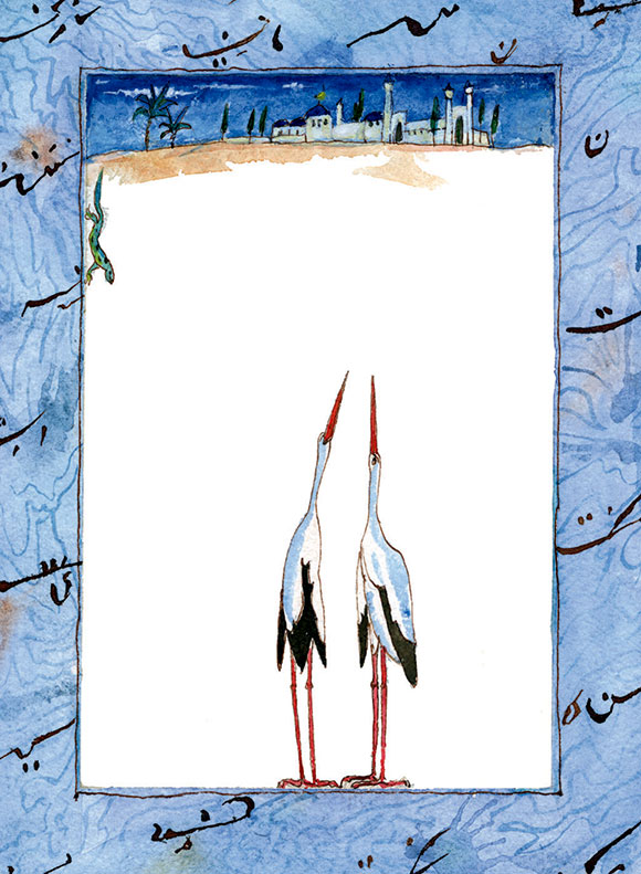 На другой день калиф вместе с визирем отправились на прогулку. Коробочку с порошком калиф прихватил с собой. – Господин! На прудах я видел аистов. Забавные птицы! Они всё время болтают что-то на своем птичьем языке. Может, мы попробуем наш порошок и послушаем их, – предложил визирь. Калиф согласился, и они отправились к прудам, где с важным видом расхаживали два аиста. Калиф достал коробочку, отсыпал себе немного порошка и протянул её визирю. Оба вдохнули волшебный порошок до последней крупинки. Тут шеи у них стали длинными, ноги вытянулись и покрылись шершавой кожей, а вместо носа появился длинный клюв. – Вот это нос! – удивился калиф. – Вы великолепны, мой господин! – низко поклонился калифу визирь. – Давай послушаем, о чем болтают аисты, – предложил ему калиф. И они, спотыкаясь, направились к ближайшим кустам. Притаившись, калиф и визирь прислушались. И правда! Они понимали каждое слово, которое произносили аисты! Это были две очень воспитанные аистихи.