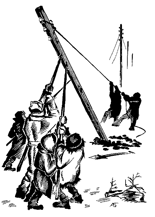 Глубже в лес — дорога лучше. На третьей версте от полустанка строители увидели на повороте просеки первый упавший столб. Под тяжестью гололеда оборвались провода по одну сторону столба, — пятивершковое[4] его бревно надломилось в корне и свалилось в другую сторону. Канаты обмороженных проводов висели с соседних столбов белыми змеями. Около упавшего столба строители раскинули палатку. Начались работы. Распоряжение перешло к Бехтееву, отцу Линька, а Старик работал наравне с другими. Бехтеев разделил рабочих на артели. Две артели по шли по линии в разных направлениях от упавшего столба с длинными шестами, околачивать с проводов наледь, чтобы облегчить их тягу на столбы. При этом некоторые провода рвались — но это-то и было нужно: так открывали ослабленный провод, который все равно упал бы потом от ветра, или при новом, даже не столь опасном натиске белого врага. Другая артель должна была поставить новый столб. Вырыли яму, Выбрали сосну; спилили, повалили, отняли верхушку и лошадьми волоком подтащили к яме. Бехтеев со Стариком вывертывали из старого столба крючья с изоляторами, зачищали и скручивали концы оборванных проволок и оловом, растопленным в котелке на жаровне, лудили скрутки, чтобы место спая лучше проводило ток. Мальчишек отрядили в лес с мешками собирать сосновые шишки, — уголья все сожгли, а шишки горели в жаровне не хуже углей. Репеёк и Линь с Балканом возвратились с полными мешками на спинах; они увидали, что новый столб обтесан, крючья с изоляторами ввернуты до отказа, — готовились к подъему. Мальчишкам велели варить кашицу на всех. Мужики — все пятеро — разложили в сторонке от палатки большой костер и в него поставили, каждый для себя: три чайника и два котелка. Сами сидели вокруг на корточках, подправляли угольки каждый под свой чайник и тихонько ругали весь свет. Столб сырой матерой сосны был неподъемно тяжел. Бехтеева считать не приходилось — он командовал. Старика все берегли. Поднимать столб приходилось Сверчку, Чорту Рыжему, Семену Бритому, да Семену с бородой. Пятеро и ничего бы — да ослаб народ. Репей и Линь варили кашицу. — Вот лодыри, — сказал Сверчок, поглядывая сердито на мужиков, — поди, Старик, чтоб подсобили. — Сам ты лодырь, Сверчок, — не упустил случая повздорить Рыжий чорт, — еще не крякнул, а уж за штаны держишься. Берись, ребята! Он схватил вагу и подвел ее под столб. — Давай, товарищи! — Давай, а те сидят да бражничают. Старик подошел к мужикам и сказал: — Чаевничать собрались? — Чаевничать, — за всех ответил черный в вязаном жилете. — Чтобы вам один чайник на пятерых: и скипит скорее, да и смотрел бы один. — А нам чего тогда делать? — Да вот нам бы подсобили. — Мы при лошадях, — угрюмо глядя в огонь и подправляя угольки под своим чайником. — Ладно. — Старик отошел. — Чего ладно? Чем ты нам угрозишь? Старик молча вернулся к столбу и на ходу бросил Бехтееву: поднимай. — Что, лодырь, не любишь, — закричал весело Рыжий Чорт Сверчку — поднапрись, Ваня. Сам он вдруг он вдруг озверел, лицо покраснело, глаза засветились, и он запел:
