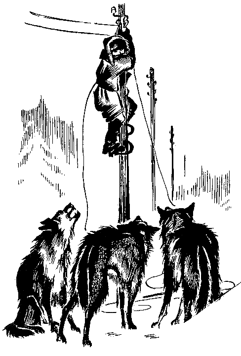 Волки отбежали, скрылись в лесу. Линёк собрался отстегнуть пояс с крюка и спуститься вниз. Из лесу опять стал слышен вой, — и к столбу сбежалось трое волков — они то присаживались к столбу и смотрели вверх, то отбегали и скрывались меж деревьев…