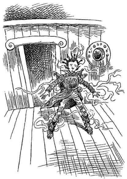 — Незабаром ти будеш на волі, — пообіцяв Живчик, витягуючи із-за пояса ножа. Устромивши тонке лезо в замкову шпару висячого замка, він почав гарячково шпортатись у ній. — Хутчій! — квапив помагай-біда. — І, ради всіх святих, пильнуй, аби М’яло-Ряснопіт тебе не застукав. — Секундочку… — процідив Живчик крізь зціплені зуби. Але замок уперто не піддавався. — Ось я тільки… Зненацька повітря розітнув оглушливий тріск. К-р-рек!!! Живчик негайно облишив замок і тривожно крутнувся на підборах. Він знав, що скоїлося. Вічна історія! Аварійні ланцюги, що допомагали утримувати на місці плавуче місто Санктафракс, постійно обривалися.