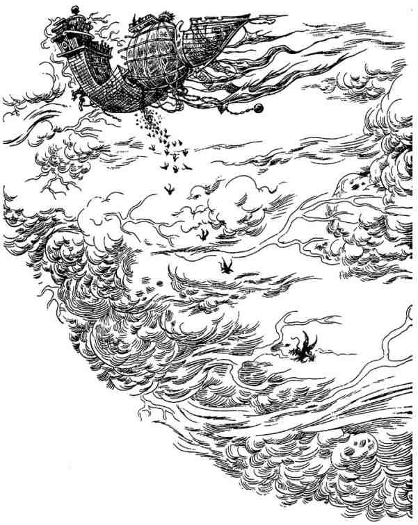 Небесний корабель перехнябився на лівий борт. Живчикові запаморочилася голова: треба було пам’ятати про стільки речей! Оскільки вітер віяв із півдня, гирі правого борту малося підняти вище, ніж лівого, а все ж не надто високо, аби корабель, бува, не ввійшов у штопор. Його завдання ускладнювалося ще й браком половини задніх гир та невгавним тріскотом старого гнилого корпусу, що страшенно діяло на нерви. — У тебе непогано виходить! — підбадьорила його знизу Камінний Штурман. У мене, серце у Живчика закалатало. Він так на це сподівався! Останнього разу, коли він спробував стернувати небесним кораблем, це обернулося нещастям — а там же був батько, готовий заступити його у скрутну хвилину. А хто підставить йому плече нині? Живчик був полишений на самого себе. — Ти впораєшся, — переконував він себе. — Мусиш упоратися! Аж це, звівши очі догори, хлопець спостеріг, що їм назустріч женеться якась чорна хмара. І — лихо та й годі! — що вище здіймався «Вітроплав», то нижче спускалася хмара. Зіткнення здавалося неминучим. — Що воно за дивовижа? — роззявив рота Живчик. Ловлячи дрижаки з ляку, він крутнув колесо ліворуч. Хмара і собі змінила керунок. — Ану ж вона в нас уженеться? — жахнувся він. Хмара дедалі ближчала. Живчик відзначив про себе дивацький гамір — лемент, писк, пронизуватий репет — і той гамір усе гучнішав і гучнішав. Зненацька він осягнув справжню природу цієї хмари. То була пташина зграя; миготіли крила, хвиськали хвости. Шуроптаство поверталося з вигнання. Уся зграя, як один, заточила навколо небесного корабля коло, друге, третє, виписуючи між вітрилами вісімку, перш ніж шугнути за борт і щезнути з очей. Вони залітали всередину крізь численні шкалубини й осідали в головному трюмі. Знайомі звуки — щебіт і шкряботіння — пробивалися угору на чардак.