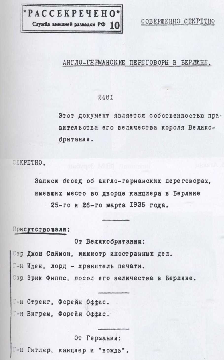 Рассекреченные документы из архива СВР России, относящиеся к деятельности внешней разведки в предвоенный период Документы № 1–8, 19–21 внешней разведкой публикуются впервые. Документы № 9-18 были опубликованы в сборнике «Секреты Гитлера на столе у Сталина. Разведка и контрразведка о подготовке германской агрессии против СССР. Март-июнь 1941 г.» (М.: Изд-во объединения «Мосгорархив», 1995).№ 1 АНГЛО-ГЕРМАНСКИЕ ПЕРЕГОВОРЫ В БЕРЛИНЕ