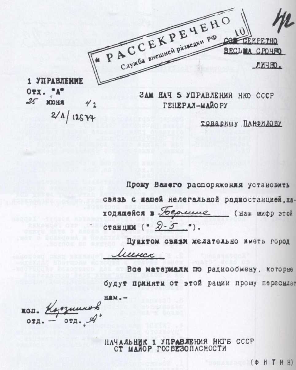 Записка начальника 1-го управления (разведка) НКВД — НКГБ П.М. Фитина заместителю начальника 5-го управления НКО СССР генерал-майору Панфилову с просьбой об установке радиосвязи с берлинской резидентурой
