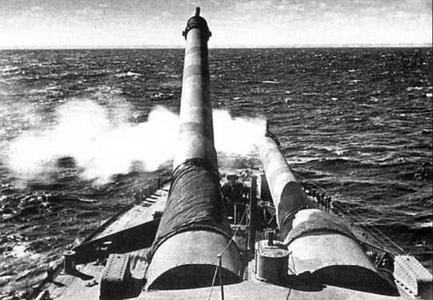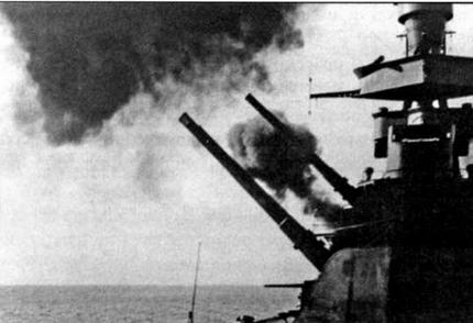 Орудия главного калибра «Альмиранте Брауна» ведут огонь при максимальном угле возвышения
