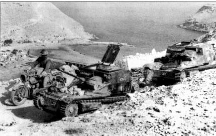 Итальянская бронетехника, захваченная англичанами при падении Тобрука и Бенгази: танкетки CV-3/35 (вверху) и средний танк М13/40 (внизу). Последний захвачен частями 6-й австралийской дивизии, о чем недвусмысленно свидетельствуют изображения кенгуру, нарисованные на башне и корпусе трофея