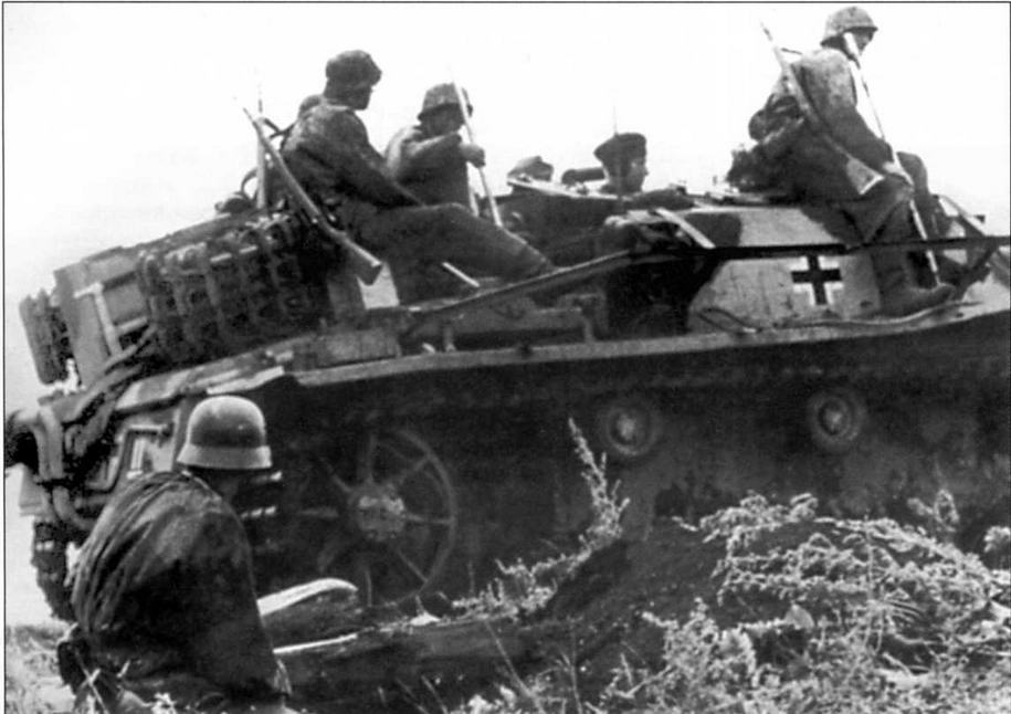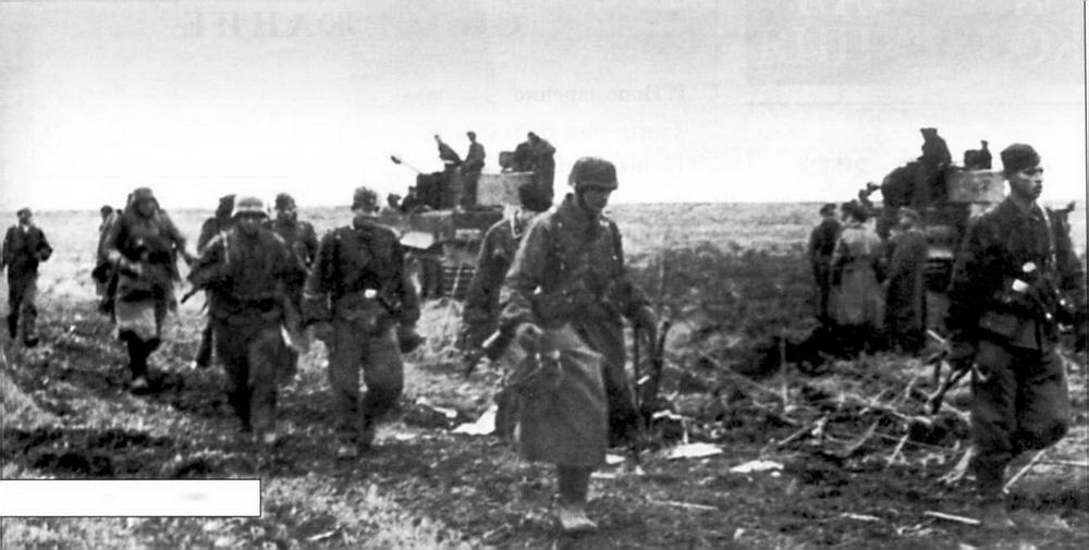 Вверху: отступление немецких войск к Днепру осенью 1943 года превратилось в серию затяжных сдерживающих боев с преследующими их частями РККА. Измотанные пехотинцы СС проходят мимо двух «Тигров» из состава тяжелой роты
