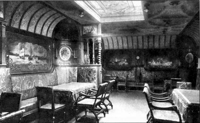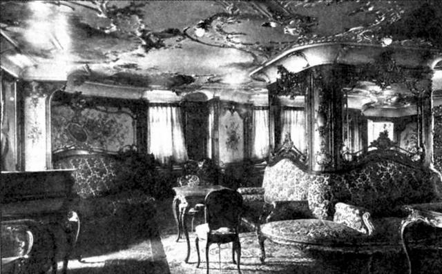 В проектировании интерьеров нового лайнера, должного затмить все суда на Алтлантике, Иоганн Георг превзошел самого себя. Сама новаторская конструкция лайнера разработки Циммермана позволила ему разместить ключевой объект на тогдашних пассажирских лайнерах - трехярусный обеденный салон первого класса - между широко расставленных второй и третьей труб, и занять пространство от борта до борта (ширина помещения 19,5 м). Именно обеденный салон был в те годы основным центром общественной жизни и развлечений на судне: четыре, а то и пять приемов пищи в день, к которым полагалось по правилам этикета переодеваться в "выходные" костюмы, сосредоточие блеска и роскоши. Парадная лестница из тика и ореха с парой изящно изогнутых пролетов, переходящих в торжественный прямой спуск на каждой из палуб шла с прогулочной палубы, через верхнюю к салону на главной палубе. По ней в салон не входили - шествовали, демонстрируя себя и внимательно разглядывая окружающих. Знаменитая парадная лестница "Титаника" была лишь повторением этого великолепного решения интерьера. Справа и слева от лестницы располагались "парадные" столы, рассчитанные на 7 едоков каждый, за одним из них обедал капитан, который, обычно, приглашал наиболее важных и известных из пассажиров за свой столик. От капитана традиция требовала не только быть хорошим моряком, но и по-настоящему светским человеком. Дальше по традиции океанских лайнеров тех лет шли "длинные столы": три параллельно расположенных стола с удобными креслами - на 112 персон, а для тех кто желал обедать семьей или компанией - еще по шесть столов, снабженных, кроме кресел, еще и идущими вдоль бортов удобными диванами, которые так нравились дамам. Всего в зале 1-го класса одновременно могли обедать 299 человек, что позволяло кормить всех пассажиров в одну смену. Но новацией интерьера были еще четыре .примыкавшие к главному и расположенные по сторонам от дымохода второй и третьей трубы, уютных добавочных салона. Смыкаясь с главным залом, они одновременно были как бы отделены от него, что очень удобно для компаний деловых людей или торжественных церемоний. Залы имели свои имена, "Луиза" (в честь матери кайзера Вильгельма), "Августа" (в честь супруги), "Бисмарк" и "Мольтке" (в честь, как сказано было в рекламном проспекте, "паладинов Кайзера"), и каждый из них имел свой вариант отделки. Весь салон был украшен деревянными белыми с золочением резными щитами и посвящен императору Вильгельму I, давшему название лайнеру. Портрет кайзера в главном салоне венчали барельефные фигуры Верности и Прозорливости, а вокруг летали крылатые фигуры Торговли, Коммерции и Судоходства. Аллегорические фигуры и общий стиль помещения, казалось, возвращали зрителя в XVII-й век. Высота потолков в салоне была 2,89 м. Сходство с дворцом добавляла галерея второго яруса, идущая от коридоров кают первого класса над помещением салона, с прямоугольным проемом и освещенная через огромный остекленный купол и третий ярус - музыкальный зал прогулочной палубы, с диванами и креслами, белоснежным роялем Steinway. Красные ковры, скатерти на столах и красная же обивка кресел завершали цветовую гамму салона. Отдельно, размером 7x3,5 м, был организован обеденный салон для детей пассажиров первого класса. Столь же шикарно были отделаны другие помещения первого класса: искусственно за