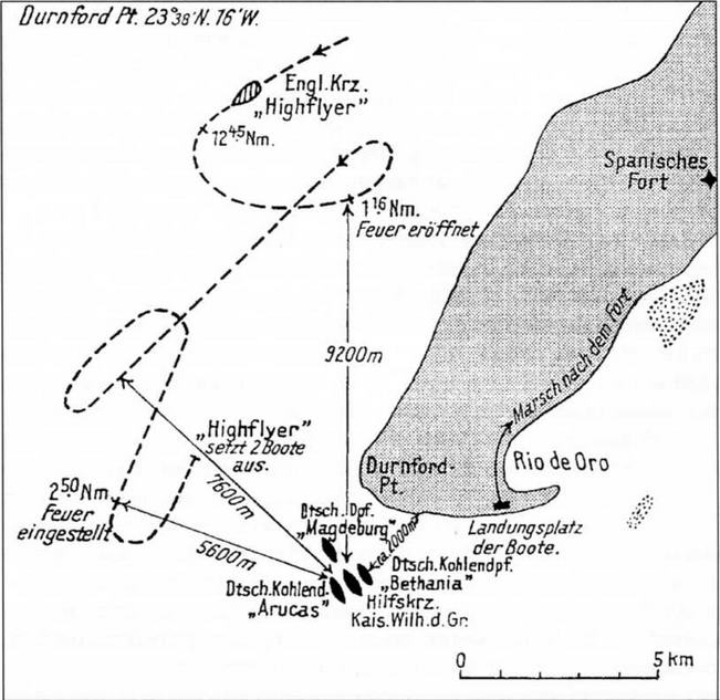 После столь удачно проведенного дня 16 августа вспомогательный крейсер наконец-то встретился со своими пароходами угольщиками. Утром 17 августа он зашел в испанские территориальные воды - рейд Рио-де-Оро, африканскую колонию нейтральной страны и начал угольную погрузку. На этот момент в трюмах корабля оставалось лишь 500 т топлива - запас на двое суток. Тут то и началась цепь случайностей и недоработок, приведшая, в конечном итоге, к гибели крейсера. Для начала выяснилось, что спешно снаряжая корабль, на нем забыли (или не успели) смонтировать систему быстрой перегрузки угля - грузовые стрелы и специальные лебедки, поднимавшие мешки большой емкости наполняемые на борту судов угольщиков. А вести погрузку через бортовые угольные порты, оставшиеся на борту еще со времен службы его вспомогательным крейсером, возможно только с специально оборудованного пирса или с низкобортных барж. Высокие же борта океанских пароходов, используемых немцами с грузом угля для пополнения запасов корсара, не позволяли никакой иной тактики погрузки кроме перегрузки мешков с углем сетками при помощи грузовых стрел. Это требовало весьма утомительной загрузки всей команды и сильно тормозило погрузку, - в сутки с одного угольщика "Дуала" удавалось погрузить не более 450 тонн угля(из которых 200 т тут же тратились на поддержание давления в котлах даже на стоянке лайнера). Как тут не вспомнить непрерывный кошмар угольной погрузки на русской Второй тихоокеанской эскадре на пути к Цусиме. Так как для продолжения крейсерства до следующего "угольного этапа" требовалось погрузить не менее 2500 т угля, стоянка затянулась бы почти на 10 дней. И это в районе, где действовали 11 британских крейсеров, переговоры которых даже иногда принимались радиостанцией "Большого Кайзера". Грузить же уголь на ходу в море капитан Рейман не рискнул. Далее следующая случайность, командир лайнера посчитал стоявшие в бухте рыболовные шхуны абсолютно безопасными для своего корабля, они не имели моторов и радиостанций и, как он думал, не могли бы дойти до ближайшего порта с телеграфом. Однако одной из рыбачьих шхун это удалось. 23 августа она передала сообщение о появлении немецкого лайнера в Лас-Пальмас, откуда эти сведения неизбежно попали в британское Адмиралтейство. К 25-му августа, казалось, что затянувшаяся погрузка наконец будет окончена, - у борта крейсера стояли два германских парохода с углем ("Бетания" и "Арукас"), а еще один "Магдебург" бросил якорь рядом. Погрузили уже 2100 т угля, и крейсер собирался уйти к вечеру. Внезапно, около полудня, у входа в бухту нарисовался силуэт трехтрубного британского крейсера. Это был бронепалубный крейсер 2-го класса "Хайфлаер" (спущен на воду в 1898-м году, 5600 т, 20 узлов, 11x152-мм орудий (на борт 6), 8x76мм орудий (на борт 4), 2 ТА). В открытом море "Кайзер" смог бы удрать от этого противника, но стоя на якоре, в бухте, имея котлы разведенные только что бы дать ход в 14 узлов? Пожалуй, положение германского корабля было безнадежным с самого начала. После короткого обмена сигналами, в основном посвященными вопросу кто первый нарушил права нейтралитета в испанских водах, британский крейсер в 13:16 открыл огонь. Командир "Кайзера Вильгельма дер Гроссе" решил принять бой, стоя на якоре (ибо все одно набрать полный ход на корабле заваленном недогруженным углем с утомленной командой