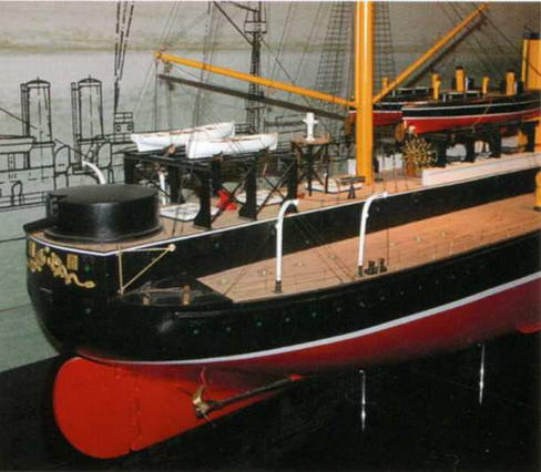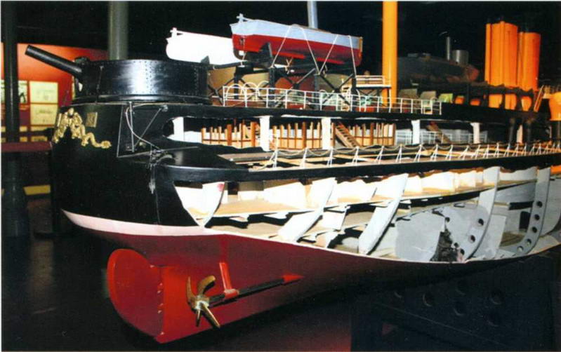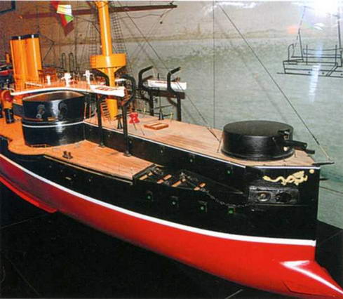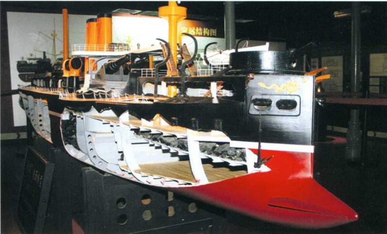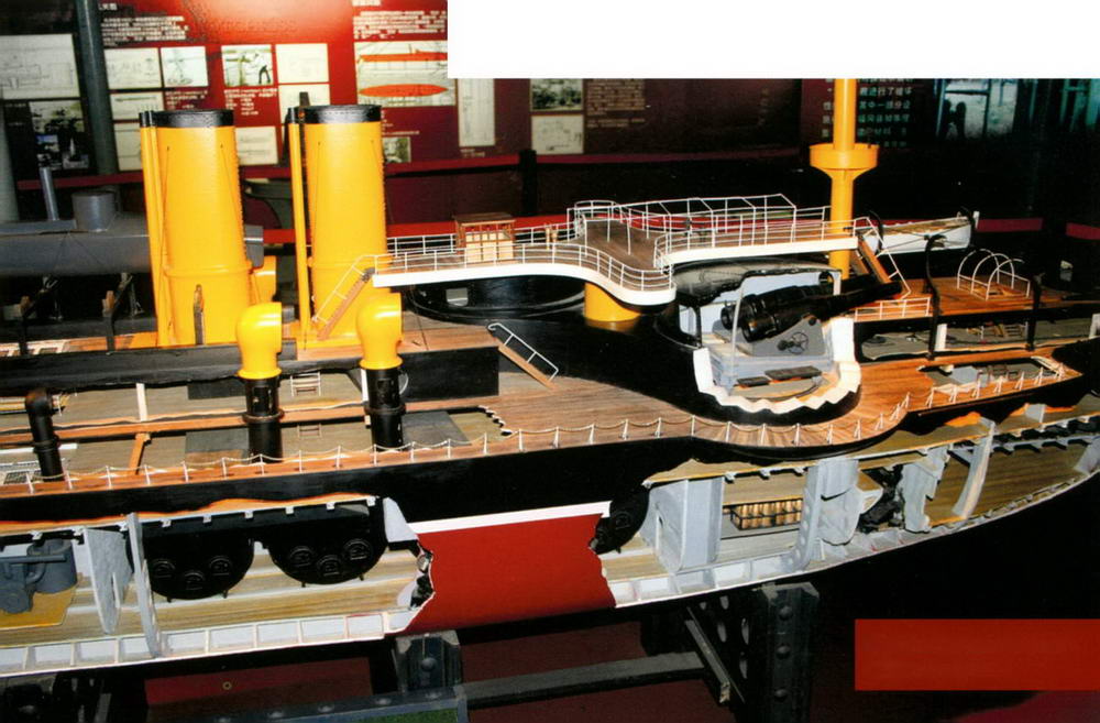 Расходы на содержание броненосцев составляли важную статью общих расходов на флот. На это ежегодно отпускались из казны огромные суммы в серебре. На каждый корабль выдавались масляная краска для окраски корпуса ниже ватерлинии, палубные тенты, чехлы для артиллерийских установок, паруса, канаты, сигнальные флаги, разнообразные материалы - медь, сталь, железо, древесина и т.д. Также требовались уголь, порох, снаряды, льняной лак для окраски корпусов кораблей выше ватерлинии, масло для гидравлических механизмов, бумага, хлопковая пряжа, наждачная шкурка и прочие непредвиденные мелочи. Ежемесячно должны были производиться закупка пресной воды, найм грузчиков для погрузки угля в порту, по необходимости - замена истрепавшегося в походах государственного флага, закупка новой форменной одежды. Это были основные статьи расхода на рутинное содержание корабля. Кроме того, были расходы на жалование, медикаменты, проведение государственных мероприятий [20 На проведение государственных мероприятий и праздников на всю Бэйянскую эскадру выделялось 3000 лян в год.] и т.д. В соответствии с "Уставом Бэйянского флота", ежемесячные расходы на один броненосец составляли 15 592 лян [21 Курс ляна к рублю колебался, но, как правило, никогда не бывал ниже 1,4 руб. за 1 лян, и выше 2,2 руб. за 1 лян.] и складывались из следующих статей: • выплата жалования офицерскому составу - 11 604 лян;[22 По данным "Устава Бэйянского флота" - 5387 лян, однако суммирование ежемесячной нормы жалования всех офицеров дает указанную, вдвое большую сумму.] • содержание корабля - 850 лян; • лекарственные средства - 25 лян; • выплата жалования нижним чинам - 3 113 лян.[23 Расчет на основании данных "Устава Бэйянского флота".] Исходя из того, что на поддержание кораблей в пригодном для службы состоянии тратилось относительно немного денег, и большая часть ассигнований шла на оплату жалования личному составу, логично предположить, что для крупномасштабных ремонтных работ, докования, замены артиллерии и т.д. требовалось выделение дополнительных сумм, а экипажи постоянно подвергались кадрированию с целью минимизации расходов. Формально эти деньги выделялись из государственной казны через Хайцзюнь Ямэнь, но на деле Ли Хунчжан порой выделял свои личные средства для поддержания кораблей в боеспособном состоянии. (продолжение следует...)Модель броненосца "Динъюань" в музее