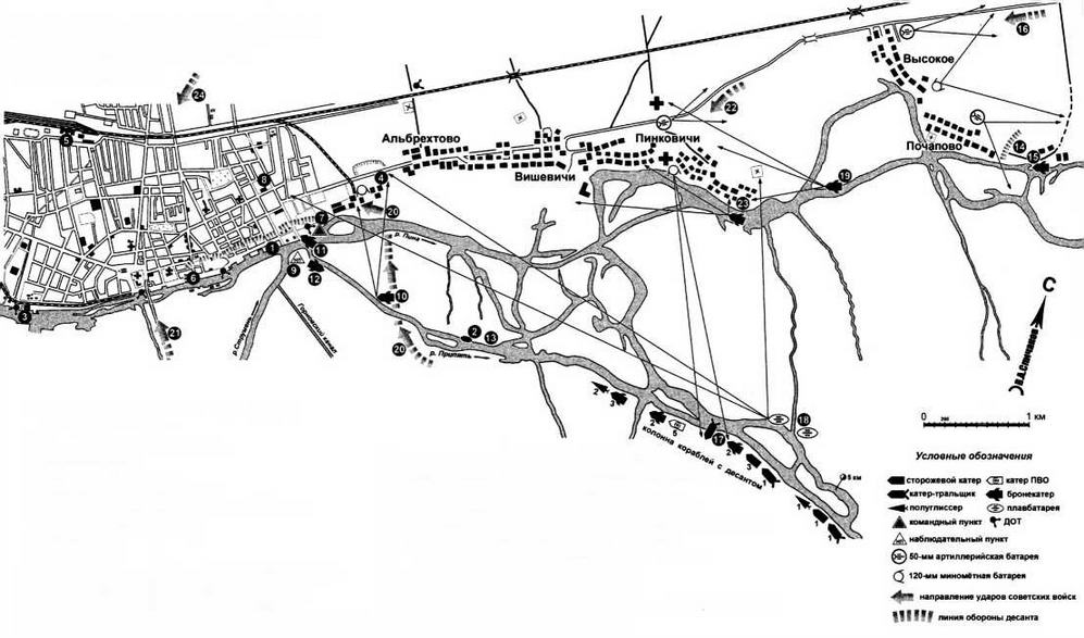 В Белорусской наступательной операции 1944 г. тактические десанты Днепровской военной флотилии стали обычным явлением. Десанты способствовали скорейшему продвижению стрелковых дивизий вдоль Припяти, но к середине июля продвижение 61-й армии отставало от общего наступления 1-го Белорусского фронта. Причинами тому были заболоченность местности, и, соответственно, отсутствие в составе армии танковых и моторизованных частей. К 10 июля немцы удерживали практически весь район около Пинска и левый берег Припяти южнее, подобие гигантского «клина» с острием к востоку от Пинска и расширяющимся основанием у Бреста, именуемый в немецких источниках «Припятский нос» (Pripjet-Nase). Фронт около Пинска удерживался различными полевыми и вспомогательными частями, вытесненными на Припятское направление как с востока, так и с юга (от батальонов охранных полков до отдельных казачьих эскадронов). Непосредственно Пинск и район севернее оборонялись 7-й пехотной дивизией, левый берег Припяти южнее Пинска удерживался 3-й кавалерийской бригадой. Территория была хорошо подготовлена в инженерном отношении к круговой обороне - по всему периметру Пинска были построены железобетонные ДОТ, а на тактически значимых рубежах оборудованы два ряда траншей полного профиля, связанных ходами сообщения. Дороги, мосты, дамбы были густо минированы - после окончания боевых действий в районе Пинска было обезврежено 49 900 мин и 397 фугасов. В контексте событий июля 1944 г., «крепость Пинск» (в числе других двенадцати городов объявлена таковой 3 марта 1944 г.) стала временным оборонительным рубежом для прикрытия общего отступления вермахта на брестском направлении. Тем не менее, для Днепровской военной флотилии операция по овладению городом Пинск стала самой сложной из совместных с Красной Армией за всю войну, а по составу задействованных сил - самой масштабной. Замысел десанта в г. Пинск принадлежит штабу 1-й бригады речных кораблей. Затем план операции был утвержден Военным Советом флотилии и доложен штабу 61-й армии. Пинск расположен на левом, возвышенном берегу р. Пина, у места слияния ее с Припятью. Конфигурация речной сети позволяла атакующим приблизиться к Пинску с востока сразу по двум направлениям и высадить десант в черте города. Данное обстоятельство позволяло не только задействовать большее количество кораблей, но и давало возможность чётко разделить зоны действия бригад флотилии: 1-я бригада речных кораблей должна была двигаться к Пинску вверх по р. Припять, а 2-я бригада речных кораблей - вверх по р. Ясельда и затем по р. Пина. Соответственно, бригады брали десант из разных дивизий: 1-я бригада речных кораблей - из 415-й стрелковой, 2-я бригада речных кораблей - из 397- й стрелковой. Днём 10 июля появился первый приказ, относящийся к предстоящей операции: командир 397-й стрелковой дивизии приказывал при содействии Днепровской военной флотилии высадить 100 человек десанта в районе с. Городище на р. Ясельда, а десант в Пинск высадить во время боёв за город. 11 июля командующий 61-й армией генерал-лейтенант П.А. Белов приказал: 89-му стрелковому корпусу и 9-му стрелковому корпусу, после 30-минутной бомбардировки противника авиацией фронта[1 Не состоялась.], перейти в наступление и овладеть г. Пинск. С началом наступления, Днепровской военной флотилии высадить в Пинске десант из состава час