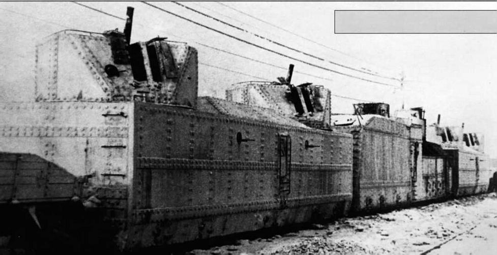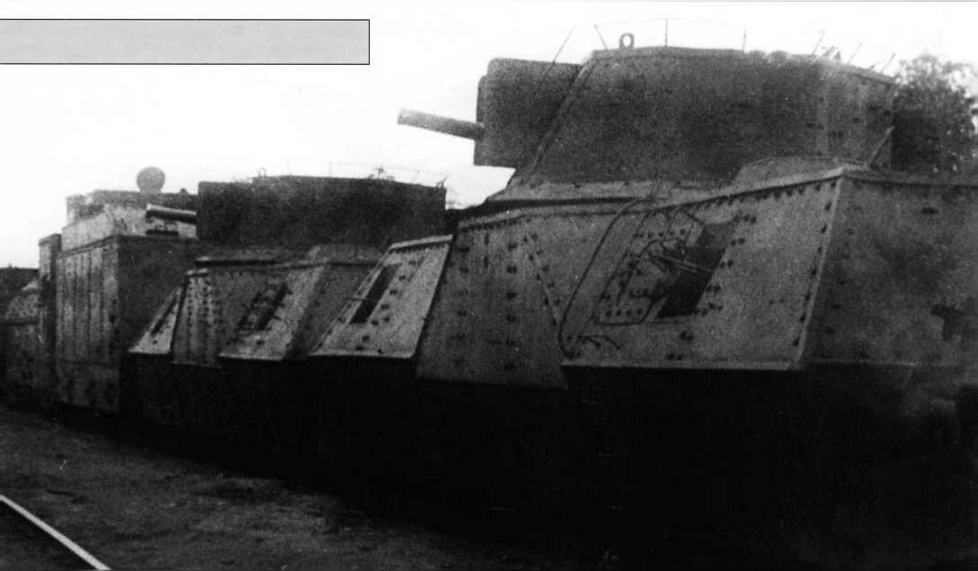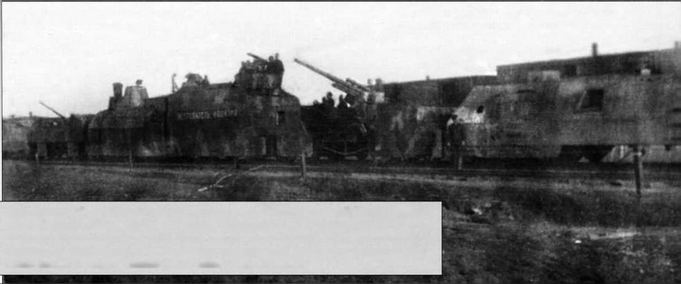 Бронепоезд № 1 «Истребитель фашизма» из состава 6-го ОДБП перед выходом в огневой налет. Лето 1942 года. Несмотря на не очень хорошее качество фото, хорошо виден состав бело - впереди площадка ПВО, за ней бронепаровоз, бронеплощадка с 76-мм зениткой образца 1938 года и 4-осная бронеплощадка с двумя башнями от танков Т-26 (АСКМ).
