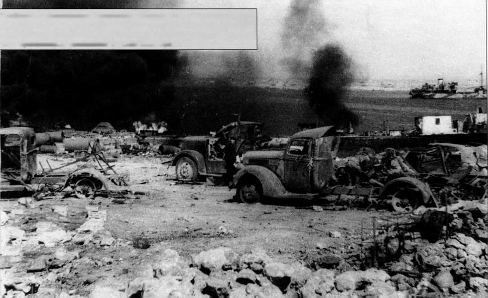 Разбитая и брошенная немецкая техника на м. Херсонес. На дальнем плане - охотник Uj-104, дважды поврежденный торпедными катерами и единожды штурмовиками, после чего брошенный экипажем в Казачьей бухте