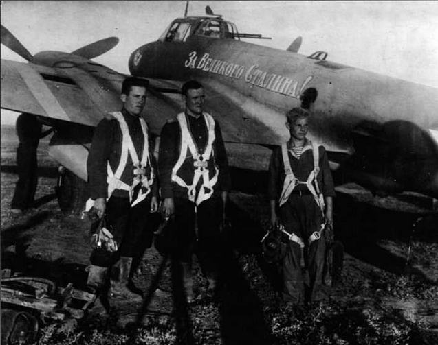 Командир экипажа Николай Иванович Горячкин, штурман Юрий Васильевич Цыпленков, стрелок-радист Сергей (прозвище Кнопка), 40-й бап, май 1944 г.