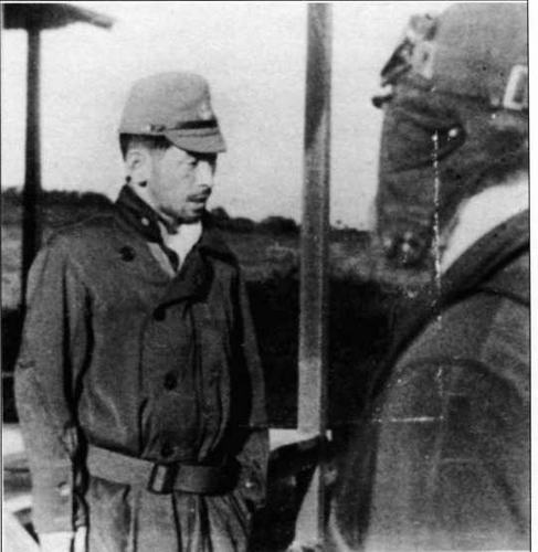 Капитан 1 -го ранга Камэи Ёсио (слева) и капитан 2-го ранга Сибата Такэо (в центре) наблюлают за отправлением лётчиков 3-й авиагруппы в первый боевой вылет, 8 декабря 1941 г.