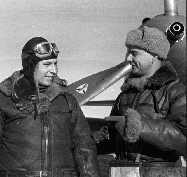Командир 9-й ГИАД полковник Покрышкин А.И. и его постоянный ведомый ст. лейтенант Голубев Г.Г., после успешного боевого вылета