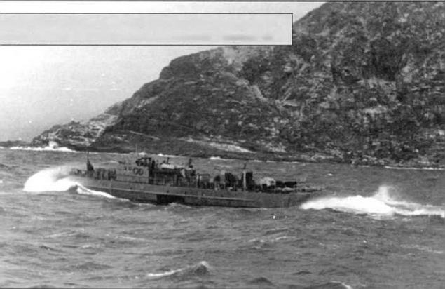 Сверху: R-1 73 повернул во фьорд и наткнулся на «Вестзее». R-162 оторвался. Снизу: Видимость улучшилась. R-173 удалось вынудить пароходы повернуть и поставить дымовую завесу. Петсамо-фьорд, как и раньше, в тумане