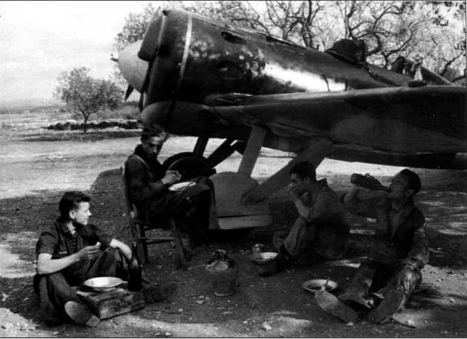 Испанский персонал обедает под крылом советского истребителя