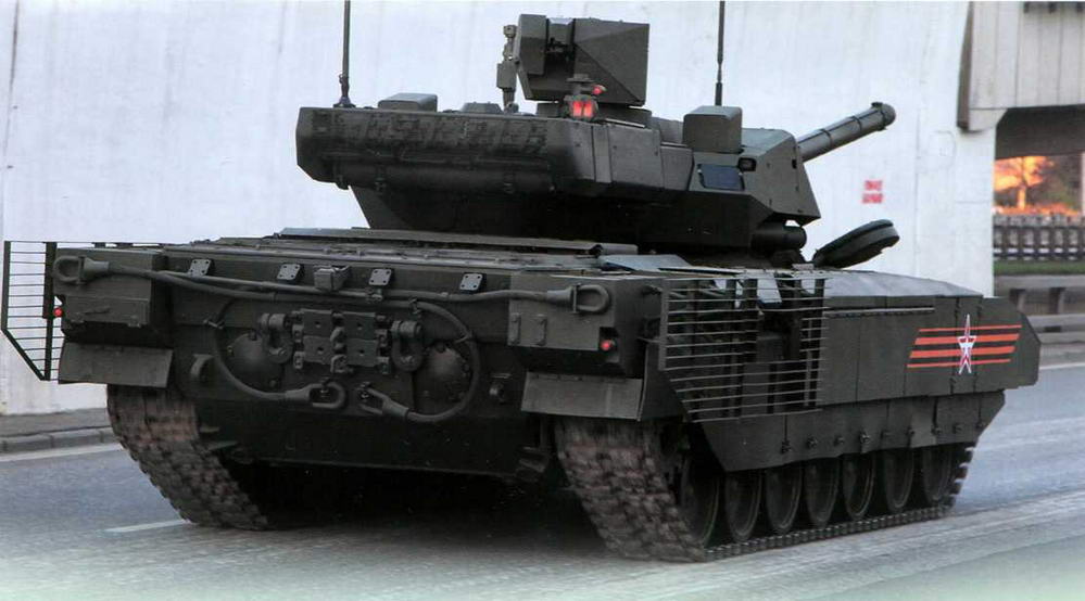 Это позволяет танку оставаться боеспособным даже в случаях множественного пробития брони. Применение броневой стали марки 44С-св-Ш, созданной в ОАО «НИИ стали», позволило без ущерба для защиты снизить толщину броневых листов на 15%. В лобовой проекции танка практически не осталось критически уязвимых мест. Отчасти к ним можно отнести расположенные слева от орудия шахты прицелов, но их дублирование резко снижает вероятность «ослепления». В конструкции корпуса и башни активно применили стелс-технологии заключающиеся в характерных плоских гранях корпуса и башни, а также специальном покрытии «Накидка». Кроме традиционного бронирования, танк имеет модули динамической защиты. Противоминную защиту обеспечивают V-образное бронированием днища и подключенные к системе уничтожения мин дистанционные миноискатели. Изюминкой конструкции стал комплекс активной защиты «Афганит». С помощью специального радара отслеживаются все летящие по направлению к танку объекты. Определив скорость, направление и размер объекта, система разворачивает устройство и подрывает заряд в направлении угрозы. Сформировавшееся ударное ядро способно поразить любой летящий со скоростью до 1700 м/с объект на расстоянии 4-5 метров от танка. Таким образом, обеспечивается уничтожение на подлете не только противотанковых ракет, но и изменение траектории полета бронебойных подкалиберных снарядов, а также повреждение кумулятивных. Силовая установка представлена разработанным в челябинском ГСКБ «Трансдизель» четырёхтактным Х-образным дизельным двигателем с газотурбинным наддувом и промежуточным охлаждением воздуха А-85-ЗА. Хотя его номинальная мощность составляет 1500 л.с., конструкторы ввели её ограничение до 1200 л.с., что позволило, без ущерба для ходовых качеств, увеличить моторесурс до 2000 ходовых часов. Дело в том, что исследования, проведенные в ведущих отраслевых научных институтах (ВНИИТМ, НИИД и пр.) показали, что оптимальные значения удельной мощности силовой установки находятся в пределах 20-25 л.с. на тонну веса машины. Превышение этих значений ведет к повышенному расходу топлива и нерационально как в экономическом, так и в техническом аспектах. Следует отметить, что конструкция корпуса позволяет размещать двигатель, как в носовой, так и в кормовой части. Это позволяет на базе платформы создавать самые различные образцы боевой и инженерной техники, не прибегая к существенным переделкам.
