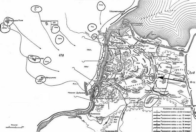 Опорный пункт в поселке был создан немцами еще зимой 1941-1942 гг. К началу операции «Искра» в районе поселка находились подразделения 374-го гренадерского полка и части снабжения. Основные силы 374-го полка занимали оборону в Рабочем поселке №8. После начала советского наступления, в качестве резерва, 26-й армейский корпус получил 3-й батальон 159-го полка из 69-й пехотной дивизии. В течение 12 января войска 2-й Ударной армии добились ограниченного успеха. Их основной противник, 227-я пехотная дивизия, смогла удержать опорные пункты в поселке Липки и Рабочем поселке №8 (в нашей работе речь о борьбе за эти участки вестись не будет). Однако севернее рощи «Круглой», на более слабо подготовленном и укрепленном участке, оборона противника была прорвана 256-й стрелковой дивизией. В ходе наступления 67-й армии немецкая оборона на берегу Невы от деревни Марьино до окраины Рабочих городков была сметена силами 136-й и 268-й стрелковых дивизий. Особенно хорошо продвигалась 136-я стрелковая дивизия Николая Павловича Симоняка. Немецкое командование было в замешательстве и растерянности. Ни в штабе 26-го корпуса, ни в штабе 18-й армии весь масштаб произошедшего не оценили. Командующего 18-й армией Георга фон Линдемана в штабе не было, он прибыл только к концу дня.
