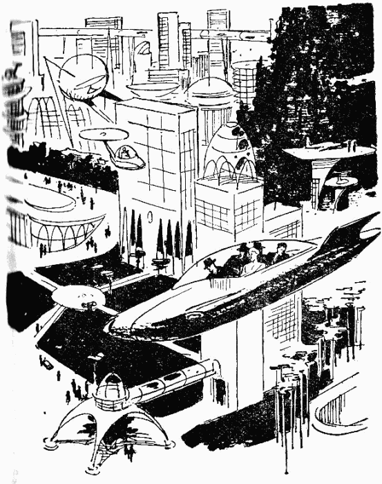 Светло-синее озеро Лей — искусственный курорт. Гористый северный берег долго скрывал его от нас (мы летели на небольшой высоте), а потом сразу увидели по его краям красивые санатории — бледно-розовые, бирюзовые, нежно-голубые, золотистые, аквамариновые, ярко-синие и просто белые здания. В небе над Леем кружились или висели в воздухе вертолеты, аэростаты, миниатюрные дирижабли, гравитомобили; повыше санаторники выполняли на авиэтках фигуры высшего пилотажа (возможно, прописанные им врачами?..). Воздух оказался столь «населенным», что я не сразу заметил дирижабль, на открытой площадке которого стояло несколько любителей острых ощущений. Мы пролетали мимо как раз в тот момент, когда пышноволосая девушка (или столетняя дама — разве на Гаяне угадаешь, да еще на расстоянии!) отчаянно ринулась вниз. — Упала! — вскрикнул я, хватаясь за подлокотники — Прыгнула… — уточнил Рат. Верно: тонкий эластичный трос извивался за девушкой. Вскоре трос натянулся, а когда до воды осталось совсем немного и я был убежден, что девушка врежется в группу купающихся, трос спружинил и, видимо, стал накручиваться на барабан, скрытый в глубине дирижабля. Скорость падения девушки замедлилась, она на секунду замерла над головами пловцов и… стремительно помчалась вверх, где ее подхватили заботливые руки веселых товарищей. И почти следом за ней из воды пулей выскочил стройный юноша, с широким поясом и плоским ранцем на спине, и вспрыгнул на площадку дирижабля! — Это еще что за штука? — спросил я. — Он надел на себя спортивный реактивный двигатель… Так можно взлететь до тысячи метров, если захочешь. — Не страшно? — Гаянцы не боятся высоты. — Но с тросом — это здорово! — сказал я. — Похоже на прыжки с штрабатом в наших земных цирках… Я еще долго мог бы любоваться этой воздухо-водо-земной жизнью, но нас заметили все и кто в чем, вернее кто на чем, понеслись к нам. Рат издал недовольный возглас и, круто развернувшись, направил машину вниз, в сторону бледно-голубой виллы, стоявшей поодаль в густой роще узких и высоких деревьев — точь-в-точь сочинские кипарисы!3