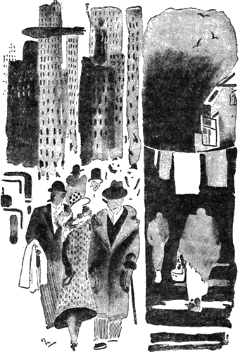 В один и тот же день в Нью-Йорк прибыли два человека. Событие само по себе мало значительное, если принять во внимание, что в город этот с семимиллионным населением ежедневно приезжает из разных мест до полутора миллионов человек. Товарищ Савичев, представитель Амторга, прибыл из Шербурга на пароходе «Олимпик». Мистер Нельсон, крупный лесопромышленник, экспрессом из штата Мен. И тот и другой остановились в отеле «Пенсильвания» — в самой большой гостинице Нью-Йорка и всего мира. Савичев в отель прикатил из гавани на авто, Нельсон с Пенсильванского вокзала (находящегося против гостиницы) прибыл по подземной дороге, подвезшей его к самому лифту. Американцу номер был заказан по телеграфу, в отеле он останавливался уже не в первый раз, и поэтому без новых впечатлений, без обычных формальностей он через несколько мгновений предстал у себя в номере перед поджидавшим его компаньоном, лесопромышленником мистером Холлом. Русский не избежал впечатлений и формальностей. Грязной и однообразной показалась ему пристань с бесконечными красными зданиями пакгаузов, Громады небоскребов, словно футуристические рисунки, намалеванные на серых полосах картона, мчались мимо авто на центральных улицах. И наконец отель «Пенсильвания» — чудовище с тремя двадцатиэтажными башнями, окруженное галле-реей магазинов — проглотило его. Он прошел колоннаду главного входа и очутился в «мейн-руме»— огромной приемной отеля. «Пенсильвания» насчитывает две тысячи двести номеров. Армия постояльцев и их посетителей, батальоны прислуги шныряют целый день по лестницам, коридорам и залам отеля. Гул голосов не умолкает день и ночь в мейн-руме. Сопровождаемый подбежавшим боем товарищ Савичев подошел к стойке, где за бесчисленными перегородками у строгих конторок стучали на пишущих машинах кукольные барышни. Прилизанный клерк задал ему вежливый вопрос и быстро продиктовал своей машинистке его фамилию и номер его новой комнаты. Копия этого печатного листка молниеносно была передана в «картотеку комнат», а оригинал — в «почтовую картотеку». Получив ключ от номера, товарищ Савичев перешел на попечение к бою, у которого на рукаве был вышит трехцветный флажок бывшей Российской империи. Это должно было соответствовать национальности приезжего (бой прекрасно владел русским языком), но мало соответствовало действительности. Савичев усмехнулся. Не потребовать же ему боя с красным флажком. Пусть их, американцы, забавляются. В коридоре у двери своего номера товарищ Савичев быстро пробежал глазами инструкции служебному персоналу отеля, подписанные заведующим, мистером Статлером. Основной принцип, преподаваемый великим мистером Статлером служащим, был принцип незаметного обслуживания. Впоследствии Савичев убедился в точном выполнении этого принципа. Номер убирался утром во время завтрака, до возвращения из ленч-рума — отельного ресторана. В стене номера был чудесный шкаф, имеющий соединение с коридором. В этот шкаф можно было положить белье, вложенное в бумажный пакет, заполнив бланк числом, к которому оно должно быть выстирано, и точно к сроку выстиранное белье обнаруживалось в шкафу. То же можно было сделать с обувью, требующей починки, и с платьем, нуждающимся в утюжке. Слугу не надо было расспрашивать о телефонных вызовах, на столе автоматическая телефонограм