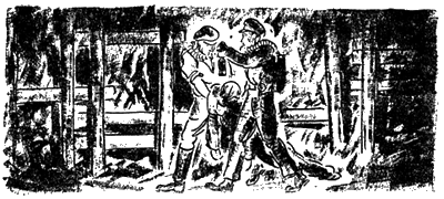 Первым выступил опять-таки Фан. Он переменил кафтан, надел на голову особую берестяную маску и довольно живо, сопровождая рассказ соответствующей, мимикой, представил медведя, который вздумал полакомиться медом. Вот он засунул лапу в дупло, вытащил кусок сота и с довольным ворчанием отправил в пасть, оно тотчас же несуразно замотал башкой и, высунув язык, оглушительно взревывая, со всех ног бросился от дупла прочь. Оказывается, медведь отправил в пасть вместе с медом несколько пчел, и те сильно ужалили мишку в язык. И вот теперь сын Торима кувыркается по полу, валяется, вскакивает, бежит и вновь падает… — Фрр!.. Брр!.. — преуморительно, под общий неудержимый хохот, фыркает и ревет Фан, поматывая половой, переваливаясь с боку на бок и ползая на корточках. Кончилось тем, что медведь угодил в болото, где охотник уложил его выстрелом в ухо. — Паф! — приложив палку к плечу, (вскрикнул Фан и в заключение торжественно и медленно протянул: — Гато-ва-а-а… После Фана выступил Микола. Он, надев такую же берестяную маску, в лицах рассказал, как в прошлом году он промышлял зверя с полатей, устроенных над отравленной падалью, Сидя на полатях, Микола сильно продрог и поэтому разика три-четыре приложился к бутылке с водкой. Охмелев, он незаметно заснул. На запах падали пришел медведь и, почуяв скрытую опасность, сильно взревел. Микола спросонья так неловко повернулся на полатях, что турманом полетел вниз на медведя, который, в сбою очередь, от неожиданности так перепугался, что опрометью пустился наутек. Однако, освобождаясь из-под Миколы, мишка здорово деранул его за ухо. — Так она, уха-то моя, — и стала — бя. Нет ухи! — продемонстрировал охотник под хохот слушателей свое ухо. Не ухо, собственно, а так — бахрому какую-то… — Бя-бя-бя-а-а! — разноголосым хором сыпалось на Миколу со всех, сторон. Когда и эта часть, самая занятная и веселая, кончилась, приступили к третьей — к гаданиям и клятвам. Медведя оттащили от стены и плашмя растянули поперек нар так, что башка его свесилась с нар. После этого все звероловы по очереди пытались приподнять голову гиганта на уровень с его туловищем. У кого это выходило легко и быстро, у того будто бы промысел будет удачливый весь год, а у кого медленно и с натугой— неудачливый. Мало того: неудачнику грозит опасность быть заеденным медведем. Чтобы избежать этой печальной участи, зверолов должен сейчас же дать клятвенное обещание никогда впредь не ругаться, не драться, не врать и не воровать. В знак же нерушимости клятвы он должен положить руку на башку медведя и твердо заявить: «Задери меня медведь, если я сказал неправду». Так, между прочим, и пришлось проделать одному зверолову из соседнего поселка, при чем все присутствовавшие дружно скрепили его клятву возгласами: — Слухали, слухати! Далеко за полночь медведя общими усилиями выволокли на улицу и при свете громадного костра отрубили у него башку и лапы по сгиб, содрали мех и разрубили тушу. Часть мяса бросили в котлы вариться, а другую, распластав на тонкие ломти, зарыли в золу жариться. К утру вся медвежья туша обязательно должна была быть с’еденной без остатка. В этой «священной жратве» и состояла последняя, заключительная часть вечорки. Ели все — и стар и млад. Ели с передышкой, с прохладцей, с уминкой с’еденного. Ели с лепешками, с поджаренным касом, с ягодами — и все с’еде