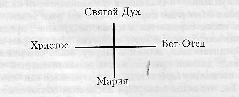 237 Здесь мы имеем еще одну из тех хорошо известных четверок, которые, как правило, замаскированы под триаду, точно так же, как и христианская Троица, которая может сохраняться как таковая только посредством исключения четвертого действующего лица божественной пьесы. Если бы это действующее лицо было введено в состав ее участников, то это была бы уже не Троица, а христианская четверка. В течение долгого времени в этом существовала психологическая потребность, что явно видно из средневековых картин, изображающих Успение и Увенчание Девы; она была также ответственна за ее возведение в ранг примирительницы, соответствующий рангу Христа, как примирителя, с той лишь разницей, что Мария только передает благодать, а не создает ее. В появившемся в последнее время толковании догмы Успения подчеркивается включение в Троицу не только души, но и тела Марии, то есть создается догматическая реальность из тех средневековых изображений четверки, которые были сконструированы по следующей схеме: