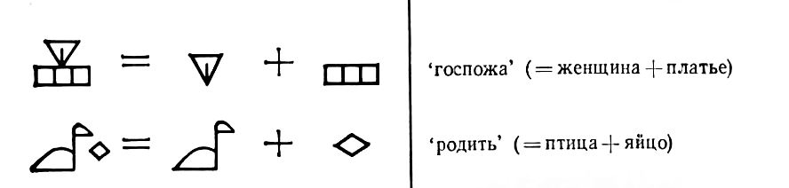 § 273. Переносы знака на целые ряды связанных смысловыми ассоциациями слов (например, ‘нога’ → ‘идти, стоять’ или ‘глаз’ → ‘видеть, смотреть, внимание, зоркость’ и т. д.), естественно, создавали и увеличивали полисемию знаков логографического письма. Там же, где логограмму начинали употреблять для обозначения слова, тождественного или близкого по звучанию, возникала принципиально новая ситуация: ведь такой перенос вел к фонетизации логограммы, к превращению ее из знака слова в знак определенного комплекса звуков, соответствующего двум или нескольким совершенно разным по значению словам. Фонетизованные логограммы широко представлены уже в древнейших, исторически известных системах письма. Например, древние египтяне передавали глагол ‘становиться’ изображением навозного жука