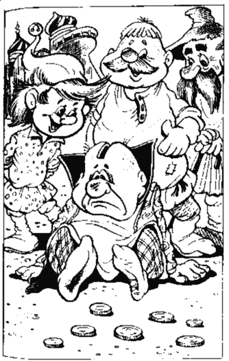 Кузнеца Игната в это время не было в городе Формалайске. Он не знал, что Аленку и Петрушку хотят сжечь на костре, поэтому и не пришел к ним на помощь. Когда Игнат вырвался из лап судьи, он скрылся в деревне. Вместе с крестьянами кузнец делил землю, принадлежащую помещику Копилке. Спасшиеся от костра Аленка и Петрушка тоже прибежали в деревню. Как радостно встретилась Аленка с отцом! Она рассказала отцу, что случилось с Петрушкой, что это он отпустил на волю самого кузнеца Игната и как смеялся над царем. — Ну и Петрушка! Ну и молодец! — приговаривал Игнат. — Теперь над Формалаем все в городе будут три недели смеяться. А чем больше будут над ним смеяться, тем меньше будут бояться его и меньше станут подчиняться. Петрушка был очень доволен похвалой кузнеца. В это время под окном послышался крик: — Копилка идет! Копилка идет! Петрушка первым выскочил на улицу. Помещик шел посредине дороги, тяжело переступая набитыми золотом ногами. За ним, немного в отдалении, двигалась толпа крестьян. Петрушка ткнул в грудь помещика пальцем и звонким голосом закричал: — Здорово, Копилка! Как живешь? — Как ты смеешь так со мной разговаривать, мальчишка. Я тебя проучу! — Он взмахнул кнутом, который держал в руке, но мальчик ловко увернулся, и кнут взметнул целую тучу пыли. Крестьяне засмеялись и плотным кольцом окружили помещика и Петрушку. — Пустите меня в мой дом. Вы не смеете меня задерживать. — Копилка снова взмахнул кнутом, требуя, чтобы ему уступили дорогу. Но никто не тронулся с места. А Петрушка изловчился, дернул помещика за штанину, а в ней зазвенели монеты. — Смотрите. Вон сколько у него золота! — крикнул Петрушка, опять увертываясь от удара кнута. — Это мои деньги! — схватился Копилка за брюхо. — Нет, не твои, — широкоплечий кузнец шагнул в центр круга, и все сразу увидели, какой он большой и сильный, и как жалок по сравнению с ним Копилка.