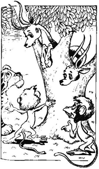 В зверинце шло большое представление. На деревянной сцене три толстые косматые обезьяны изображали Трёх Толстяков. Фокстерьер играл на мандолине. Клоун в малиновом костюме, с золотым солнцем на спине и с золотой звездой на животе, в такт музыке декламировал стихи: